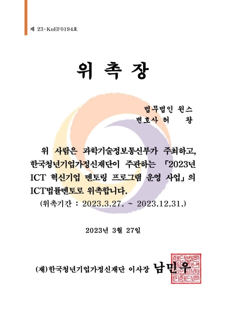 법무법인 윈스 허왕 대표변호사는 2023. 3. 27. 과학기술정보통신부가 주최하고 한국청년기업가정신재단이 주관하는 '2023년 ICT 혁신기업 멘토링 프로그램 운영 사업'의 ICT 법률멘토로 위촉되었습니다.
